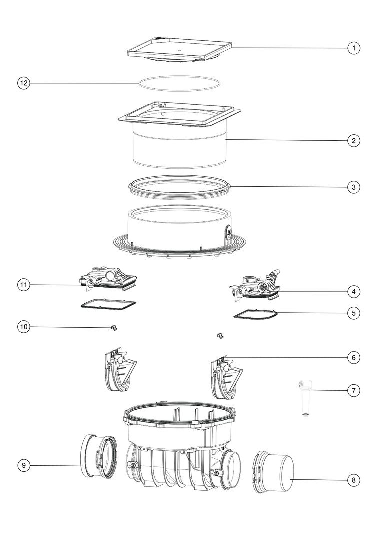 mit Zu-/Auslaufstutzen, teleskopisches Aufsatzstück und Flansch für Abdichtung im Verbund, Abdeckung befliesbar oder schwarz, Einbautiefe 516-669 mm, Aussparungsmaße 750 x 750 mm, Einbau in die Bodenplatte, Zu-/Auslauf DN 200 Hydraulik entspricht DN 150