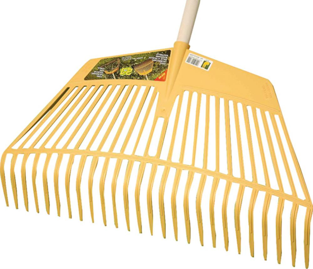 Laubrechen zum Zusammenfegen von Laub und Grasschnitt, durch Umdrehen wird aus dem Laubrechen eine
