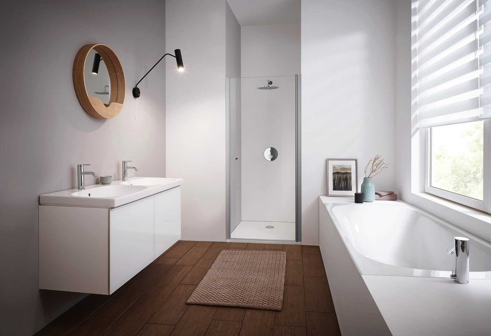 teilgerahmt, für den Einsatz in Nische oder mit verkürzter Trennwand an Schließseite, 1-teilig mit einem Pendelelement, für Wandanschlag links und rechts verwendbar, für Fronteinstieg, Profile aus Aluminium, mit Einscheibensicherheitsglas nach DIN EN 12150, optional mit reinigungsfreundlicher GlasPlus-Beschichtung, geeignet für Montage auf Duschwanne und auf dem Boden, für die Einbausituation in Nische oder in Kombination mit einer verkürzten Trennwand, Breitenverstellung an zwei Seiten, Wasserhemmleiste optional montierbar, an der Wand mit Wandprofil befestigt, Wandprofil mit stufenloser Breitenverstellung und zum Ausgleich von Schrägen, Breitenfixierschrauben mit Abdeckkappen, mit Hebe-/Senkmechanismus, Knaufgriff innen und außen, möglich sind Sondermaß, Schrägzuschnitt, alleinstehend montierbar, Montagezustand teilvormontiert, zu kombinieren mit TwiggyPlus W in kurzer Ausführung, bestehend aus: ein Türelement, zwei Wandprofile, Wasserhemmleiste, Zubehör, Montageset, Produktdokumentation