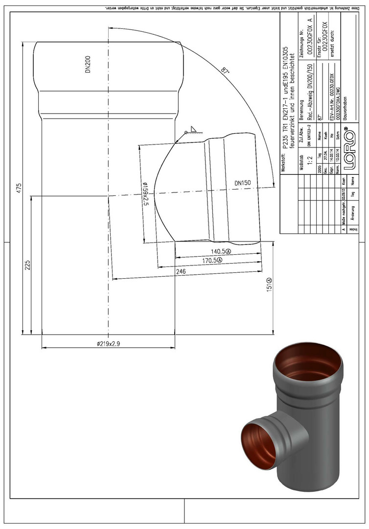 LORO X Reduzier-Abzweig DN 200/150, 87Grad