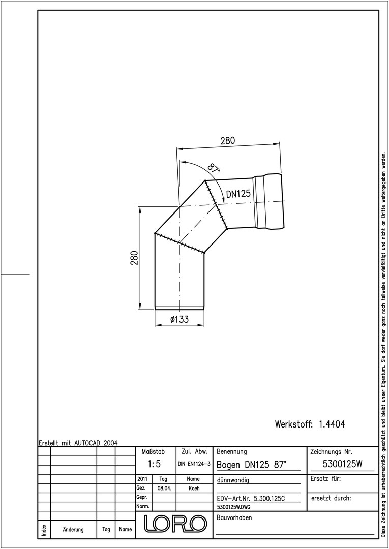 LORO XCL Bogen DN 125, 87°, Werkstoff 1.4404