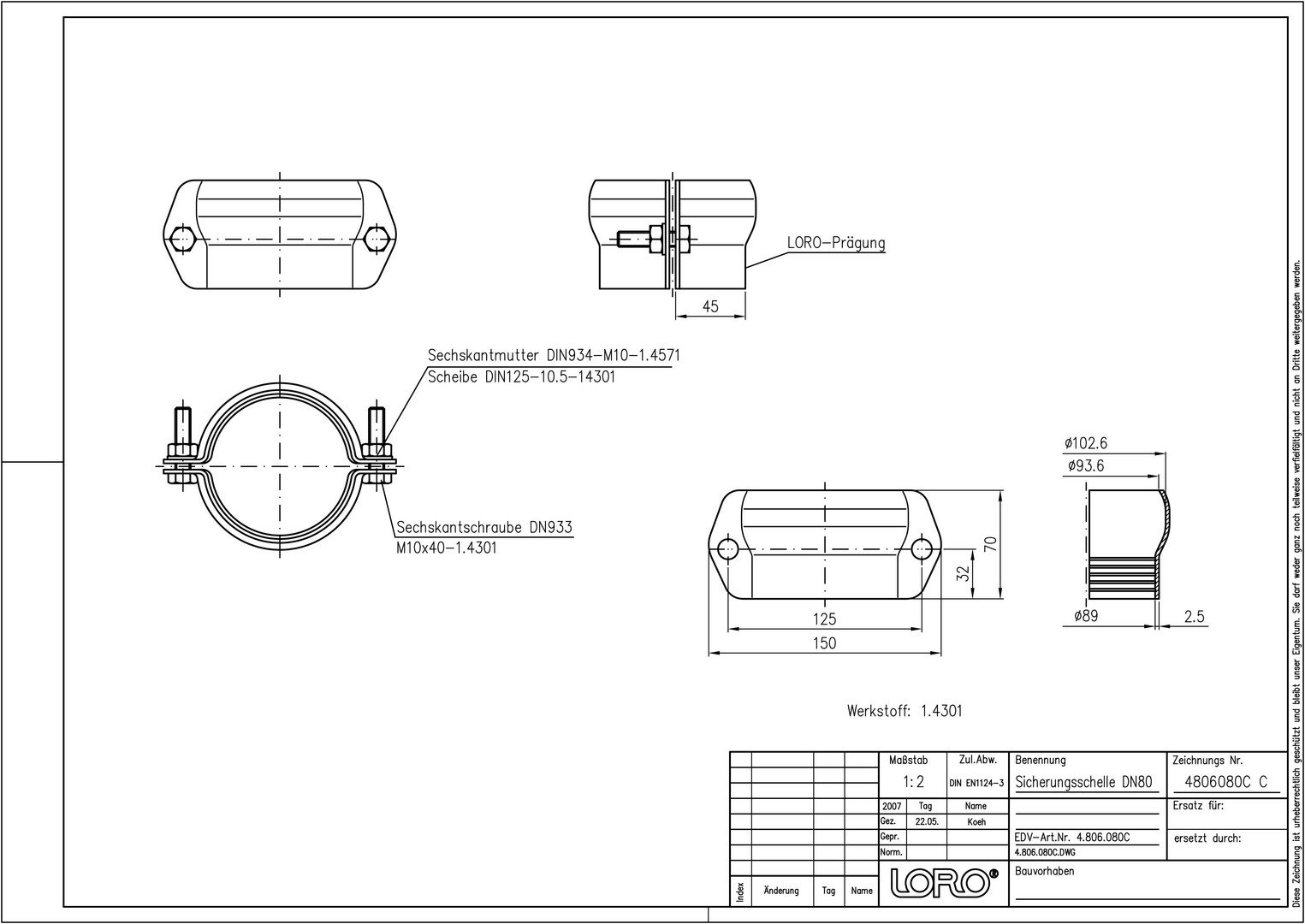 LORO XCL Sicherungsschelle DN 80, Werkstoff 1.4301
