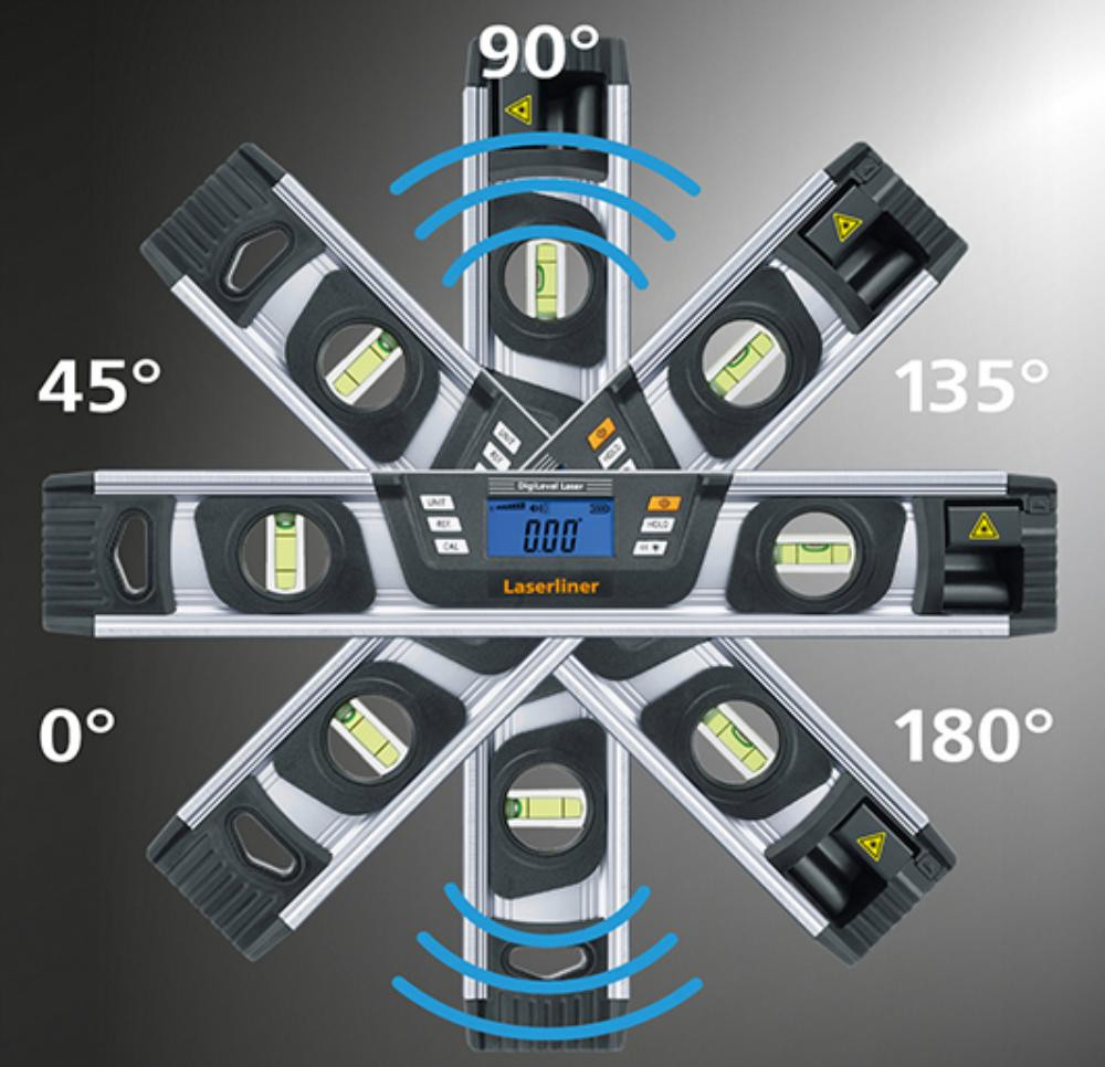 • Anzeige in Grad, Prozent, mm/m, in/ft