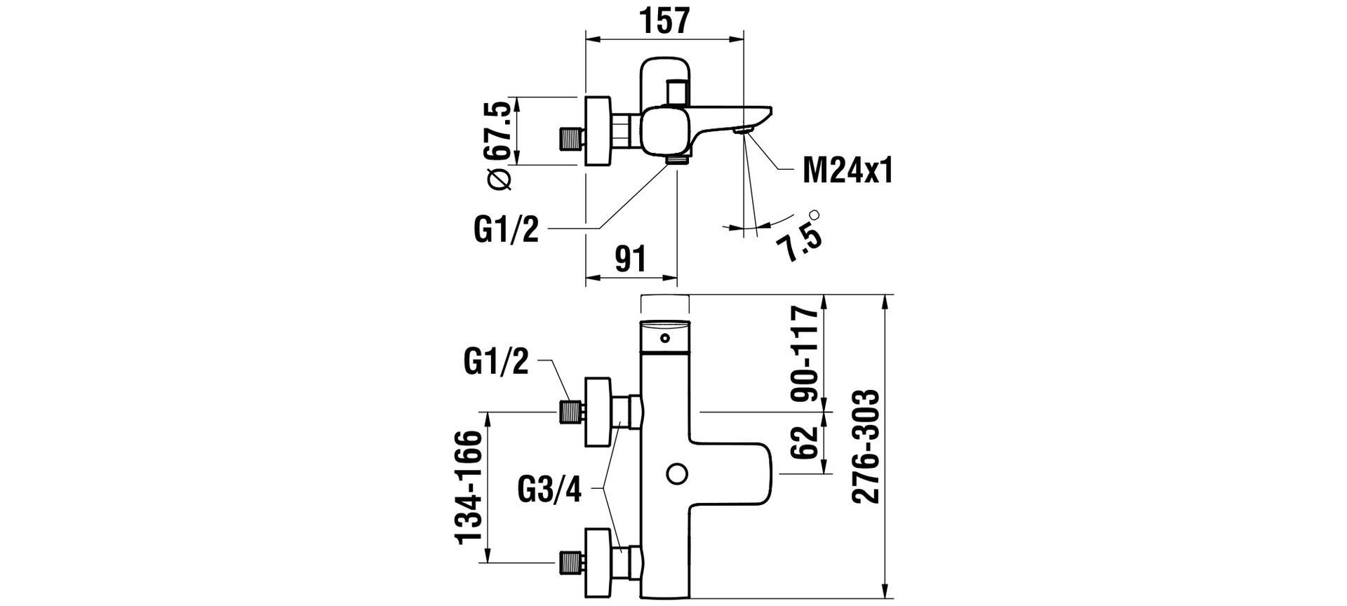 Anschlussmaß 134-166 mm, ohne Wandhalterung und Brausestange, Temperatur-und Mengenbegrenzung, Kartusche Ecototal umgekehrt, automatischer Umsteller, Perlator M 24 x 1 HC (C), Perlatordemontagemit Münze, S-Anschluss DN 15, Durchfluss/Schallwert-Gruppe: Auslauf: 20,5 l/min (3 bar)/IC, Brause: 9,9 l/min (3 bar)/IA