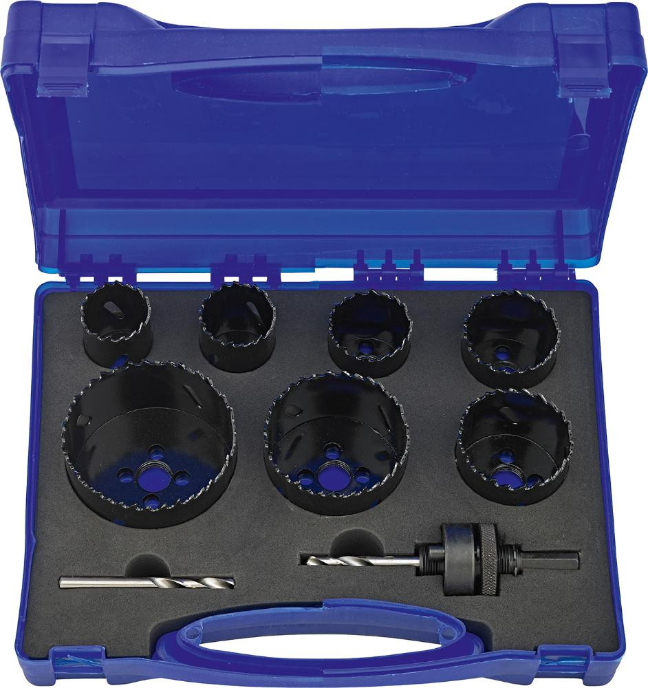 • Satz bestehend aus dem Aufnahmeschaft, dem auswechselbaren Zentrierbohrer und den Sägeblättern