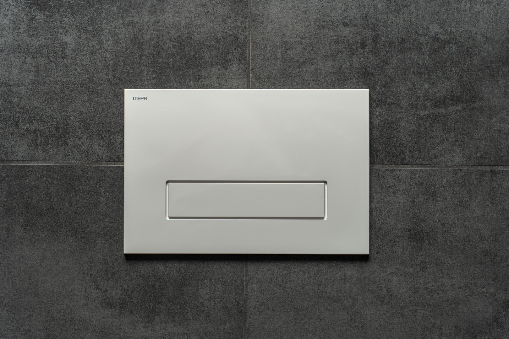 zur mechanischen WC-Spülauslösung bei MEPA UP-Spülkästen, Kunststoff, 217 x 147 x 10 mm, Betätigung von vorne oder von oben, für aufgesetzte oder fliesenbündige Montage, EasyConnect-System für werkzeuglose Montage der Betätigungsplatte, bestehend aus Befestigungsrahmen, 1x Drückerstange, 2x Distanzbolzen und Befestigungsmaterial