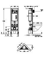 vormontiert für wandhängendes WC, zur Trockenbaumontage in einer Raumecke, zur Einzelmontage vor eine Massivwand, Systembauhöhe 1200 mm, selbstragender Montagerahmen, geeignet zur Beplankung mit Gipsfaser- oder Gipskartonplatten, pulverbeschichteter Profilrahmen, höhenverstellbare Fußstützen 0-190 mm, UP-Spülkasten Sanicontrol Typ E31, 2-Mengen- oder 1-Mengen- oder Start/Stopp-Spültechnik, Spülkasten komplett vormontiert, Prüfung und CE-Kennzeichnung gemäß DIN EN 14 055, Wasseranschluss links oben, Spülmenge 6/3 l (Werkseinstellung), Spülmengen parallel einstellbar (große Spülmenge 6-7,5 l stufenlos, kleine Spülmenge 3-4,5 l, stufenlos), maximales Spülvolumen 7,5 l, bei Werkseinstellung sofortiges Nachspülen möglich, mechanische Betätigung von vorn, WC-Anschlussbogen 3-fach tiefenverstellbar, Anschluss Dusch-WC-Systeme möglich, besteht aus Wasseranschluss G 1/2 A mit integriertem Eckventil und Handrad, PE-Wand-WC-Anschlussbogen DN 90, PE-Wand-WC-Anschlussgarnitur DN 90, PE-Übergangsstück DN 90/110, Wand-WC-Befestigungsset M12, Bauschutzkasten für Revisionsöffnung, 2x Schutzstopfen, Gipsfaserplatte 1190 x 415 x 12,5 mm, mit vorgestanzten Durchbrüchen, Befestigungsmaterial
