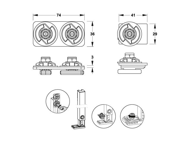 zur Verbindung von Montageelementen oder Stützen mit einer C-Profil-Front- und Bodenschiene, zur Verbindung von in der Höhe gekürzten Montageelementen oder Stützen, Stahl sendzimir-verzinkt, Zinkdruckguss, bestehend aus 5x Fußplatten Schienenmontage links, 5x Fußplatten Schienenmontage rechts, 10 Montagelaschen