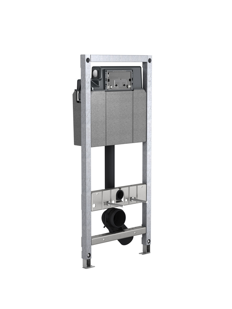 vormontiertes Montageelement für wandhängendes WC, für Trockenbaumontage, zur Einzelmontage vor eine Massiv- oder in eine Ständerleichtbauwand, zur Schienenmontage vor eine Massiv- oder vor eine Ständerleichtbauwand, selbsttragender Montagerahmen, geeignet zur Beplankung mit Gipsfaser- oder Gipskartonplatten, sendzimir verzinkter Profilrahmen, höhenverstellbare Fußstützen 0-240 mm, Fußplatten drehbar, Tiefe passend zum Einbau in UW-Profil UW 50 und UW 75 und MEPA-C-Profil, Mittel- und Meterrissmarkierung zur exakten Ausrichtung der Achsmitte und Montagehöhe des Elementes, geeignet zur Wandbefestigung mit Stockschrauben M10, UP-Spülkasten Sanicontrol Typ P31, 2-Mengen- oder 1-Mengen- oder Start/Stopp-Spültechnik, EasyConnect-System für werkzeuglose Montage am Spülkasten, Spülkasten komplett vormontiert, Prüfung und CE-Kennzeichnung gemäß DIN EN 14 055, Wasseranschluss links oder hinten, Spülmenge 6/3 l (Werkseinstellung), Spülmengen getrennt einstellbar große Spülmenge 5 – 7 l, stufenlos, kleine Spülmenge 3 – 4,5 l, stufenlos, maximales Spülvolumen 7,5 l, bei Werkseinstellung sofortiges Nachspülen möglich, schwitzwassergedämmt, mechanische Betätigung von vorn, WC-Anschlussbogen 3-fach tiefenverstellbar, besteht aus Montage-Set zur Montage in Ständerleichtbauwand, Wasseranschluss G 1/2 A mit integriertem Eckventil und Handrad, PE Wand-WC-Anschlussbogen DN 90, PE Wand-WC-Anschlussgarnitur DN 90, Wand-WC-Befestigungsset M 12, Bauschutzkasten für Revisionsöffnung, 2 Schutzstopfen, Befestigungsmaterial