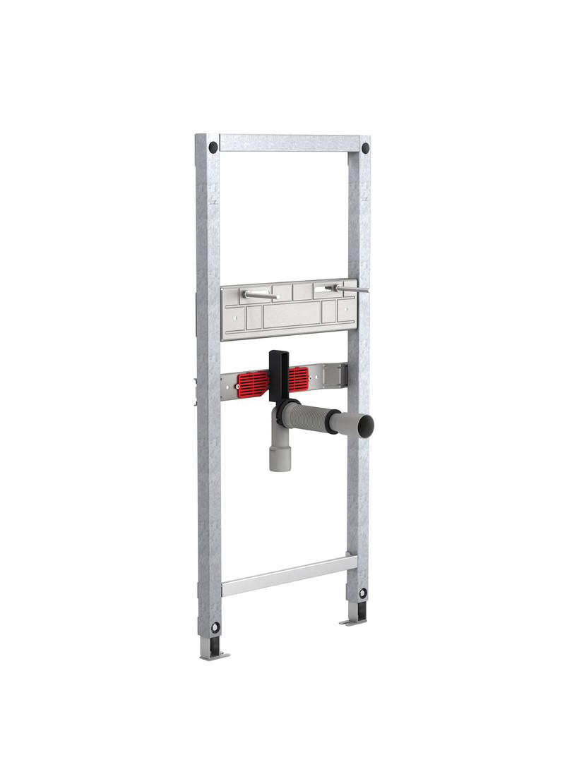 vormontiertes Montageelement, für Waschtisch-Einlochbatterie, für Trockenbaumontage, zur Einzelmontage vor eine Massiv- oder in eine Ständerleichtbauwand, zur Schienenmontage vor eine Massiv- oder vor eine Ständerleichtbauwand, selbsttragender Montagerahmen, geeignet zur Beplankung mit Gipsfaser- oder Gipskartonplatten, sendzimir verzinkter Profilrahmen, höhenverstellbare Fußstützen 0-240 mm, Fußplatten drehbar, Tiefe passend zum Einbau in UW-Profil UW 50 und UW 75 und MEPA-C-Profil, Mittel- und Meterrissmarkierung zur exakten Ausrichtung der Achsmitte und Montagehöhe des Elementes, geeignet zur Wandbefestigung mit Stockschrauben M10, höhenverstellbare Anschlusstraversen für Wasseranschluss, Ablauf, Keramikbefestigung, Lochabstand Keramikbefestigung 150 – 240 mm und 280 mm, Montage handelsüblicher Wandscheiben G 1/2 möglich,besteht aus Montage-Set zur Montage in Ständerleichtbauwand, 2 Montageplatten zur Aufnahme handelsüblicher Wandscheiben, höhenverstellbarer Ablaufbogenhalter, HT-Siphonbogen DN 40/50 mit Gummimanschette NW 32/40 kürzbar, mit Bauschutzstopfen, 2x Gewindebolzen M10 und Befestigungsmaterial