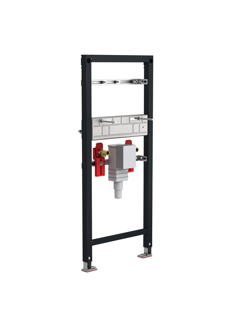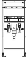 vormontiertes Montageelement, zur Montage gemäß DIN 18 040, für Trockenbaumontage, zur Einzelmontage vor eine Massiv- oder in eine Ständerleichtbauwand, zur Schienenmontage vor eine Massiv- oder vor eine Ständerleichtbauwand, selbsttragender Montagerahmen, geeignet zur Beplankung mit Gipsfaser- oder Gipskartonplatten, pulverbeschichteter Profilrahmen, höhenverstellbare Fußstützen 0-240 mm mit integrierter Rutschhemmung, Fußplatten drehbar, Bohrfehler ausgleichend, Tiefe passend zum Einbau in UW-Profil UW 50 und UW 75 und MEPA-C-Profil, Mittel- und Meterrissmarkierung zur exakten Ausrichtung der Achsmitte und Montagehöhe des Elementes, werkzeuglos höhenverstellbare rutschhemmende Anschlusstraversen für Wasseranschluss/Ablauf/Keramikbefestigung, Lochabstand Keramikbefestigung 150-240 mm und 280 mm, Montage handelsüblicher Wandscheiben G 1/2 möglich, besteht aus Montage-Set zur Montage in Ständerleichtbauwand, 2x schallgedämmte MEPA-Wandscheiben G 1/2, UP-Siphon mit verchromtem Anschlussrohr und Abdeckplatte Kunststoff verchromt (Geruchsverschluss im UP-Gehäuse 50 mm höhenverstellbar, herausnehmbar), 2x Gewindebolzen M10 und Befestigungsmaterial