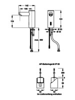 Waschtischarmatur ohne Mischung, für die Entnahme von kaltem und vorgemischtem Leitungswasser aus dem Trinkwassernetz, Einsatzbereich Innen, 142 x 151 x 53 mm, Ausladung 105 mm, für Lochstanzung Ø 35 mm, zur Montage auf Waschtisch oder Arbeitsplatte (Stärke 2-40 mm), aus Messing in chromglanz, Armaturengruppe I nach DIN EN 200, Schutzart IP 55, für Standmontage, Durchflussbegrenzer 6 l/min, vandalensicher, Strahlregler M24 diebstahlgesichert, Infrarot-Näherungselektronik, bistabiles Magnetventil 6 V, Betriebsdruck 0,5-8 bar, max. Auslauftemperatur 60 °C, Nachlaufzeit einstellbar von 0,5-10 s (Werkseinstellung 1 s), automatischer Auslaufstopp einstellbar von 60-180 s (Werkseinstellung 60 s), zuschaltbare periodische Hygienespülung (einstellbar in 10 Intervallstufen von 24-240 h, Dauer Hygienespülung einstellbar von 30-120 s, Reinigungsstopp Dauer 60 s, einstellbare Funktionen über Sanicontrol-Fernbedienung SC 900 (Nachlaufzeit, Auslaufstopp, Hygienespülung, Ansprechbereich), für Edelstahlbecken geeignet, nachrüstbar, ohne Ablaufgarnitur, geeignet für druckfeste elektronische Durchlauferhitzer, nicht geeignet für druckfeste hydraulische Durchlauferhitzer, bestehend aus 1x Armatur mit integrierter Infrarot-Näherungselektronik und Magnetventil, Befestigungsmaterial, 1x flexibler Anschlussschlauch R 3/8 (Länge 400 mm), 1x Rückflussverhinderer, 1x Schmutzfangsieb, 1x Flachdichtung 3/8", 1x Batteriegerät 6 VDC, Schutzart IP 65 (zur Montage unter dem Waschtisch), 4x Batterien Typ LR6 1,5 V, 1x Montageschlüssel für Strahlregler, 1x Sanicontrol-Fernbedienung SC 900