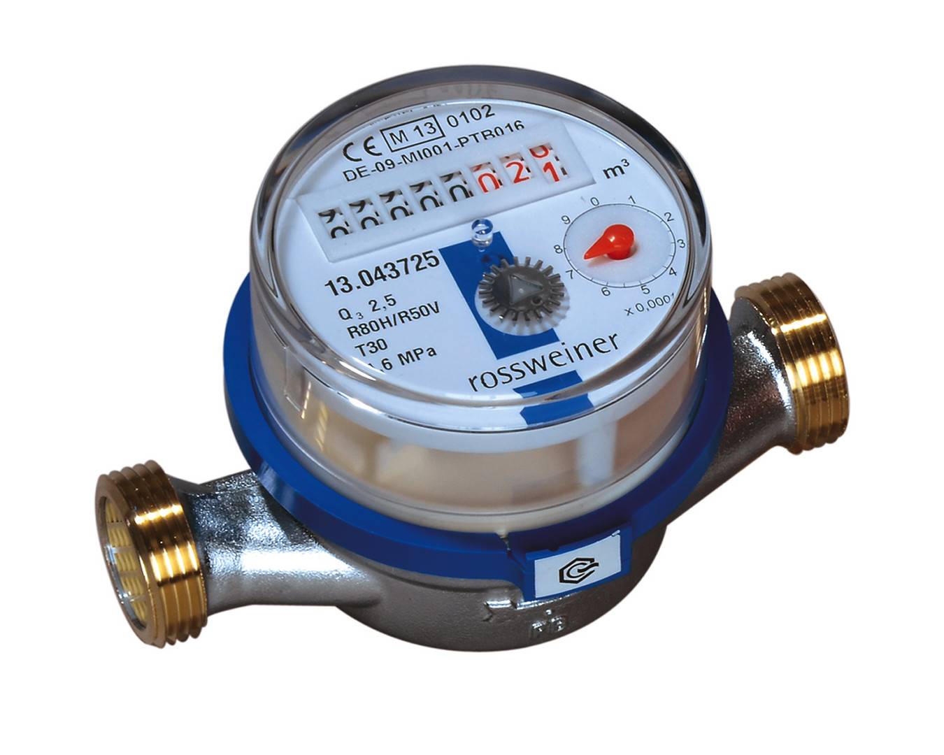 Eingang AG G 3/4, Ausgang AG G 3/4, Einstrahl-Trockenläufer, für waagerechten und senkrechten Einbau, Gehäuse aus Pressmessing, zulässiger Betriebsdruck PB 16 bar, zulässige Betriebstemperatur TB Kaltwasser 30 °C, Warmwasser 90 °C, Medium Trinkwasser, Zulassung nach MID