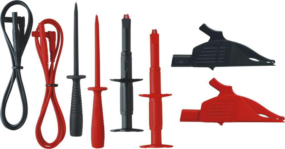 Inhalt: Sicherheitsmessleitungen (Silikon), Sicherheitsprüfspitzen (schlanke Messspitze), Sicherheits-Klauengreifer und Sicherheits-Krokodilklemmen.