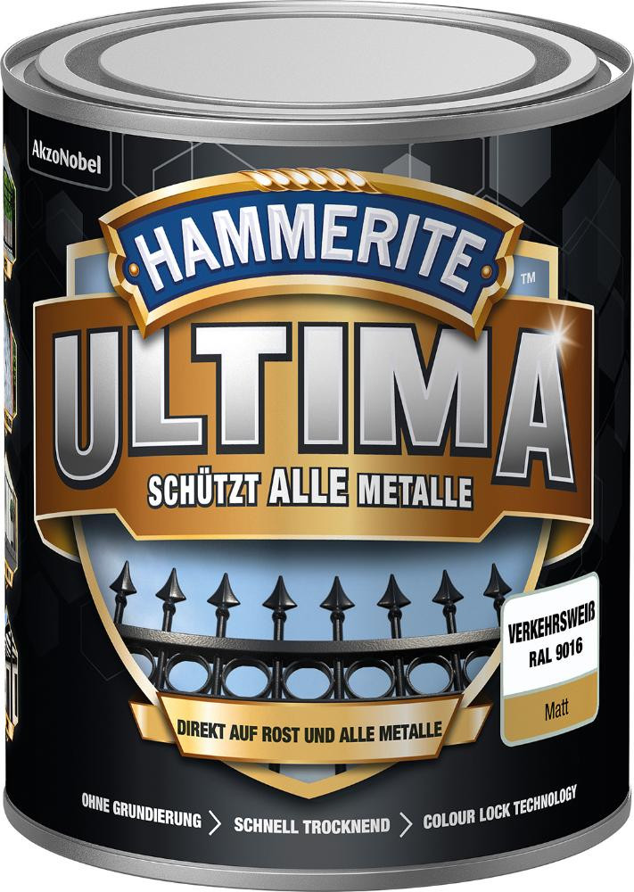 Hochwertiger Schutzlack für blanke wie auch rostige Eisenmetalle, Zink, Aluminium und Altbeschichtungen im Außenbereich. Rostschutz, Grundierung und Lackierung in einem. Hammerite ULTIMA bietet mit seiner speziellen Colour Lock Technology eine langanhaltende Farbton- und Glanzstabilität. Geeignet für Gartenzäune, Treppen- und Balkongeländer, Garagentore, Fenstergitter, Außenlampen, Fahrräder, Zierpflanzen-Rankgitter, etc.