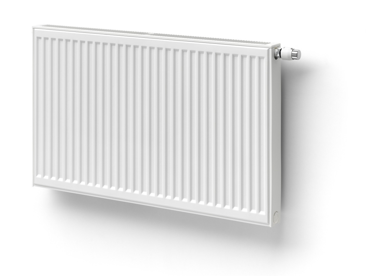Niedertemperatur-Ventilheizkörper mit serieller Durchströmung (die vordere Platte wird zuerst durchströmt), 1 lagig mit 1 x Konvektorblech, mit seitlichen und oberen Verkleidungen (abnehmbar), aus kaltgewaltztem Stahlblech nach EN442-1, mit rückseitig angeschweißten Aufhängelaschen, Wärmeleistung geprüft nach DIN EN 442 bei 75/65/20 Grad = 608 Watt, bei 70/55/20 Grad = 487 Watt und bei 55/45/20 Grad = 309 Watt, Sickenteilung: 33mm, Prüfdruck: 13 bar, Betriebsdruck: 10 bar, Max. Betriebstemperatur: 110 Grad, Anschlüsse: 2 x 3/4" Außengewinde und 2 x 1/2" Innengewinde, Anschlüsse unten Nabenabstand: 50 mm, Bauhöhe: 400 mm, Baulänge: 900 mm, Bautiefe: 61 mm, Farbe: Stelrad RAL 9016, Fabrikat: Stelrad, Modell: Novello ECO, Typ 11, Artikel-Nr.: 0291041109