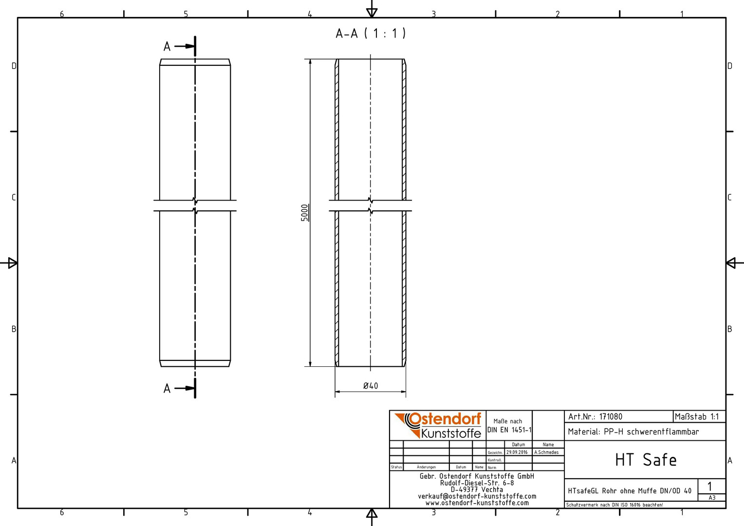 Ostendorf HTsafe Rohr GL DN/OD 40, 5000 mm, ohne Muffe