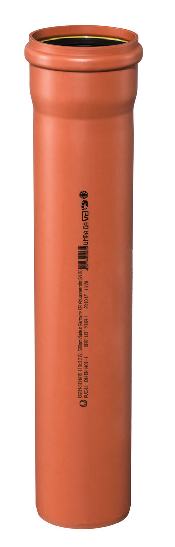 aus PVC-U (Polyvinylchlorid, weichmacherfrei), Vollwandrohre DIN EN 1401, Anwendung für erdverlegte Abwasserkanäle und -leitungen, Montage DIN EN 1610, DIN EN 476, DIN 1986-100, orangebraun RAL 8023, Dichtung das Vollwandrohr SN 10 wird mit einem deutlich verbesserten werkseitig eingelegten Dichtsystem angeboten, die neue Lippendichtung hat einen eingelegten Polypropylen-Stützring, die geforderte Dichtigkeit nach DIN EN ISO 13259 mit Druck und Vakuum wird weit übertroffen, der Dichtring wird nach DIN EN 681 gefertigt, für öl- und fetthaltige Abwässer sind NBR-Dichtringe zu verwenden, Chemische Beständigkeit Ableitung von aggressiven Medien im Bereich pH 1 bis pH 13, Vollwand-Rohre mit homogenem Wandaufbau