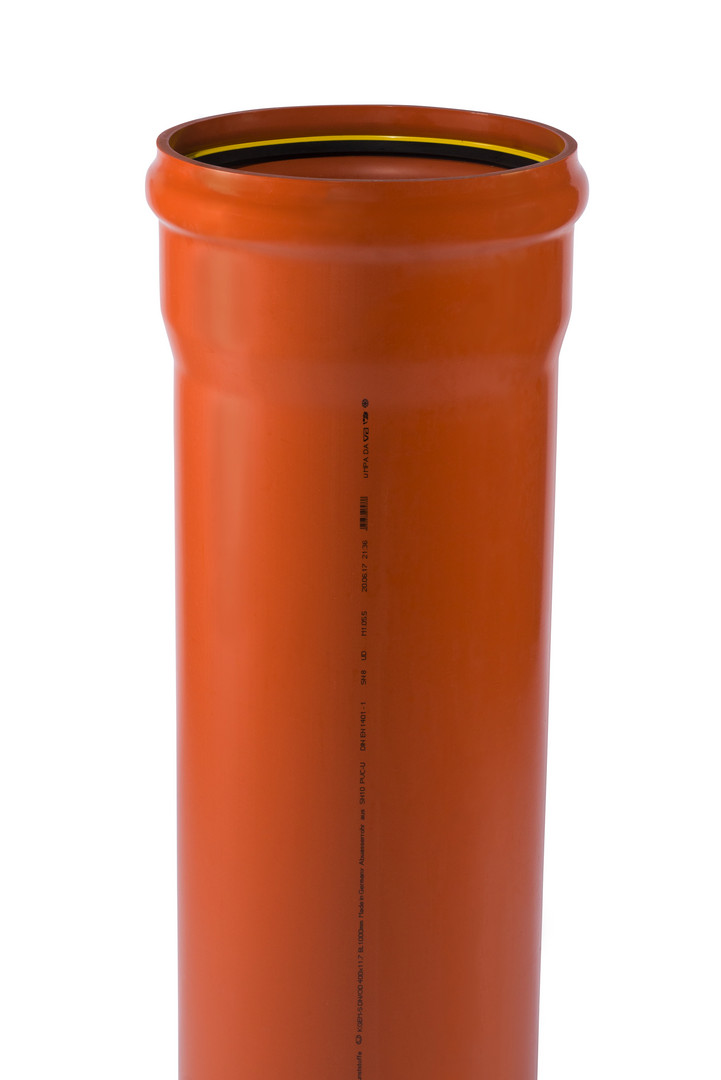 aus PVC-U (Polyvinylchlorid, weichmacherfrei), Vollwandrohre DIN EN 1401, Anwendung für erdverlegte Abwasserkanäle und -leitungen, Montage DIN EN 1610, DIN EN 476, DIN 1986-100, orangebraun RAL 8023, Dichtung das Vollwandrohr SN 10 wird mit einem deutlich verbesserten werkseitig eingelegten Dichtsystem angeboten, die neue Lippendichtung hat einen eingelegten Polypropylen-Stützring, die geforderte Dichtigkeit nach DIN EN ISO 13259 mit Druck und Vakuum wird weit übertroffen, der Dichtring wird nach DIN EN 681 gefertigt, für öl- und fetthaltige Abwässer sind NBR-Dichtringe zu verwenden, Chemische Beständigkeit Ableitung von aggressiven Medien im Bereich pH 1 bis pH 13, Vollwand-Rohre mit homogenem Wandaufbau