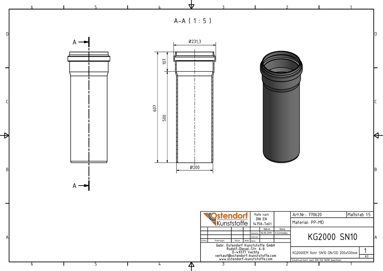 Ostendorf KG2000 Rohr SN 10 EM DN/OD 200, 500 mm, mit Muffe