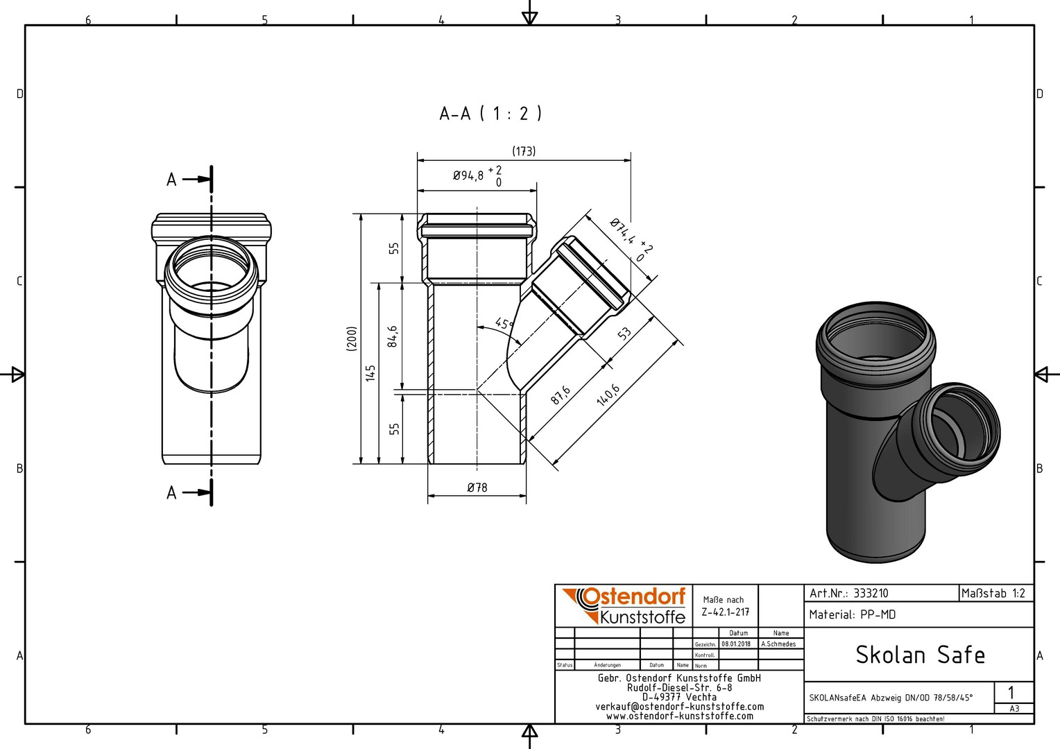 Ostendorf SKOLANsafe Abzweig EA DN/OD 78/58, 45Grad