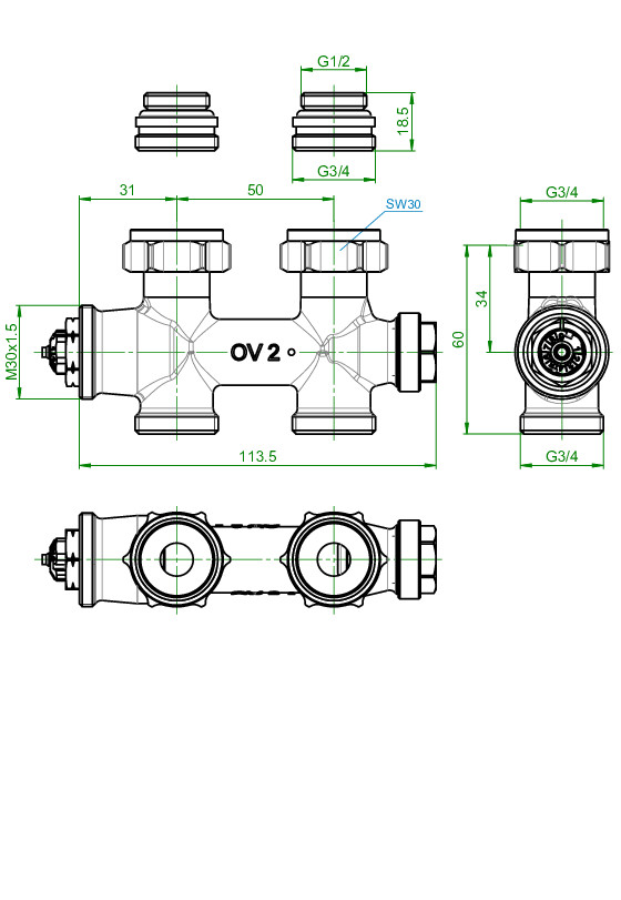 voreinstellbar, Thermostatanschluss links oder rechts, mit Befüll- und Entleerung, Betriebstemperatur 2-120 °C, Messing vernickelt, Thermostatgewinde M 30 x 1,5, absperrbar, Medium Wasser/Wasser-Glykolgemisch, Rohrabstand 50 mm, max. Betriebsdruck 10 bar