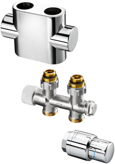 Oventrop Anschlussset Multiblock T Durchgang, Edelstahl-Design, für den Anschluss an Heizkörper mit G 1/2 IG