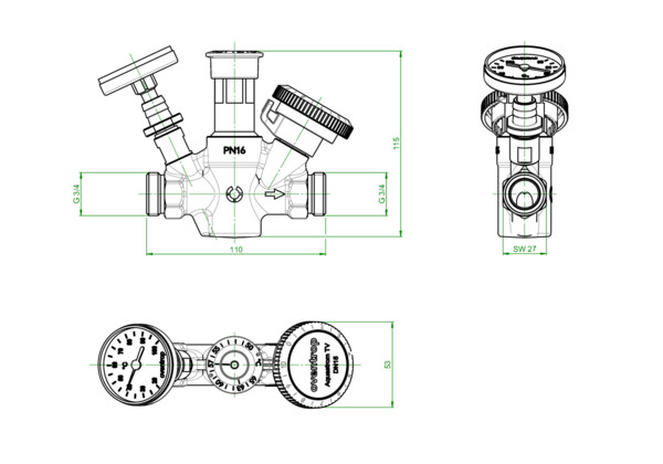 Gehäusewerkstoff Siliziumbronze, Einbauort Zirkulationsleitung, Betriebstemperatur bis 90 °C, max. Betriebsdruck 16 bar, Medium Trinkwasser, Einstellbereich 50-65 °C, mit Voreinstellung, reproduzierbare Voreinstellung, Voreinstellung blockierbar, absperrbar, Entleerung, Zeigerthermometer, Wärmedämmung