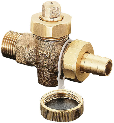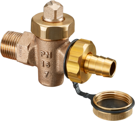 Oventrop KFE-Hahn Schwermodell DN 25, AG, PN 16, Schlauchverschraubung und Verschlusskappe, Rotguss
