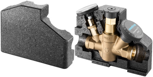 Gehäusewerkstoff Siliziumbronze, Einbauort Zirkulationsleitung, Betriebstemperatur bis 90 °C, max. Betriebsdruck 16 bar, Medium Trinkwasser, Einstellbereich 50-65 °C, mit Voreinstellung, reproduzierbare Voreinstellung, Voreinstellung blockierbar, absperrbar, Entleerung, Zeigerthermometer, Wärmedämmung