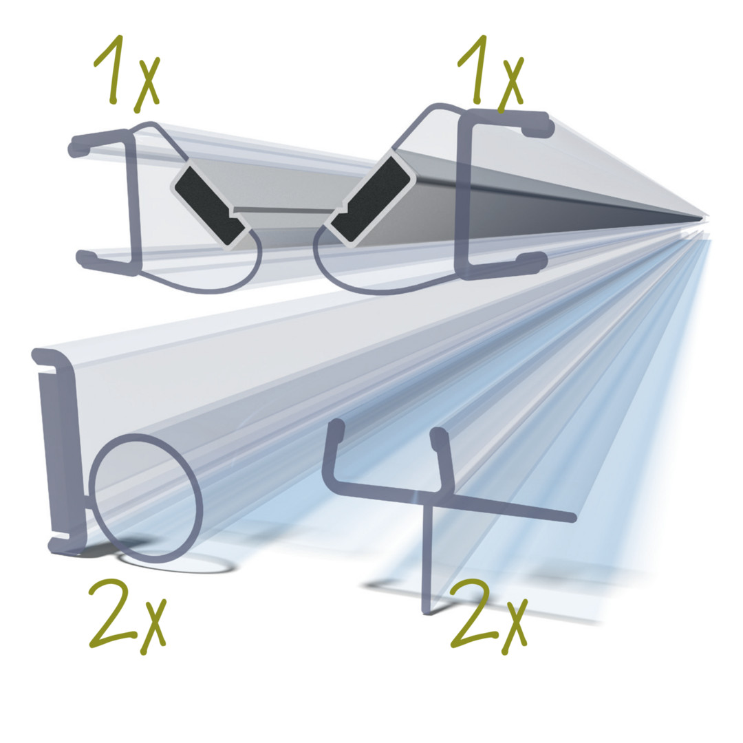 2 x Scharnierdichtung, Länge 2000 mm (105888), 1 x Magnet-Türdichtprofil 45° Grad links, Länge 2000 mm (106764), 1 x Magnet-Türdichtprofil 45° Grad rechts, Länge 2000 mm (106765), 2 x Bodendichtung, Länge 1000 mm (104791)