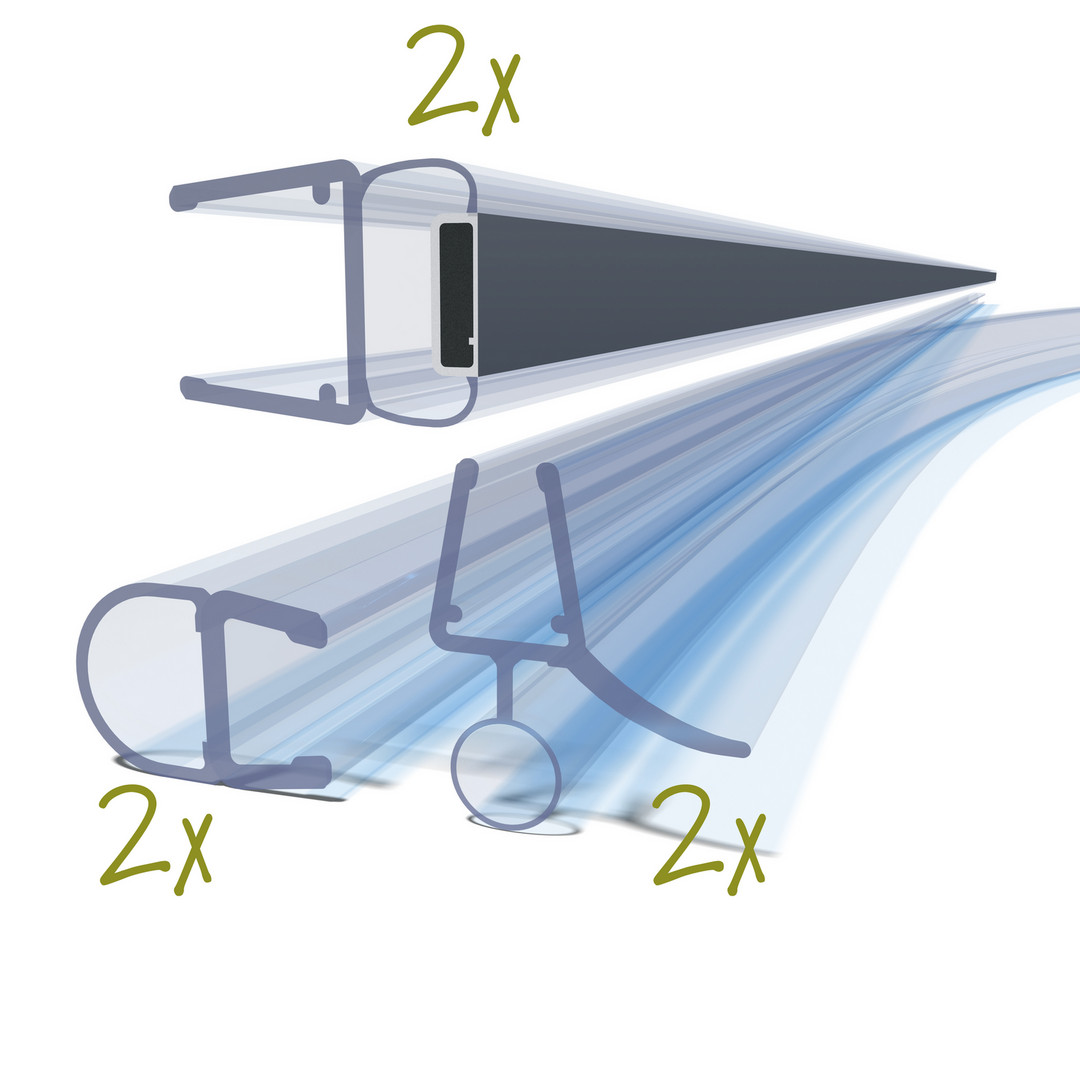 2 x Scharnierdichtung, Länge 2000 mm (105959), 2 x Magnet-Türdichtprofil 90° Grad links, Länge 2000 mm (105836), 2 x Bodendichtung gebogen, Länge 1000 mm (102117G)