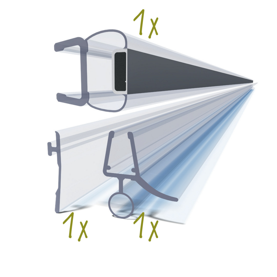 1 x Abstreifdichtung, Länge 2000 mm (104402), 1 x Magnet-Turdichtprofil 90° Grad, Länge 2000 mm (105836), 1 x Bodendichtung, Länge 1000 mm (102117)