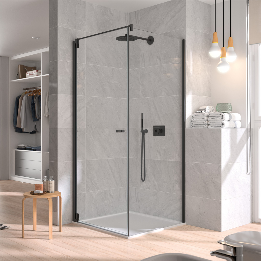 Glas 6 mm ESG transparent, Standardhöhe bis 2000 mm, keine Sonderhöhen möglich, links und rechts verwendbar, Pendeltüren öffnen nach innen und außen, optional mit 4 mm hoher Schwallschiene, PALM.free, PALM.fix, PALM.lift, PALM.invisible, optional PALM.nano