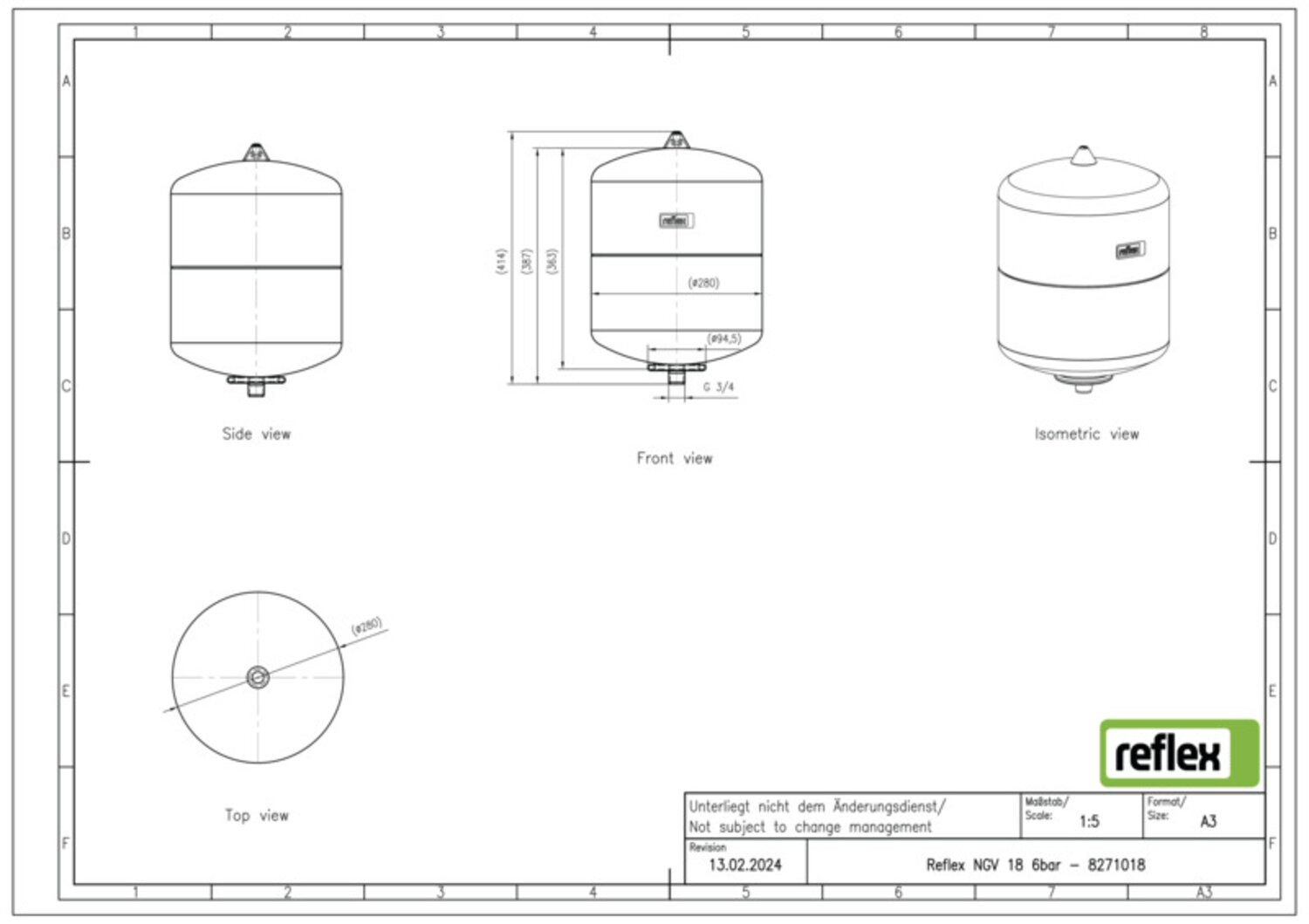 Reflex Membran-Druckausdehnungsgefäß NGV 8 1,5 bar/70 °C, G 3/4, grau W817048