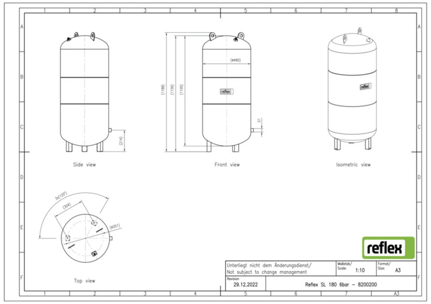 schlankes Gefäß für geschlossene Heiz- und Kühlsysteme, nicht tauschbare Halbmembran nach DIN EN 13831, mit werkseitig druckbeaufschlagten Gasraum, Epoxidharzbeschichtung, mit Gewindeanschlüssen, Frostschutzmittelzusatz mind. 25-50 %, max. Systemtemperatur 120 °C