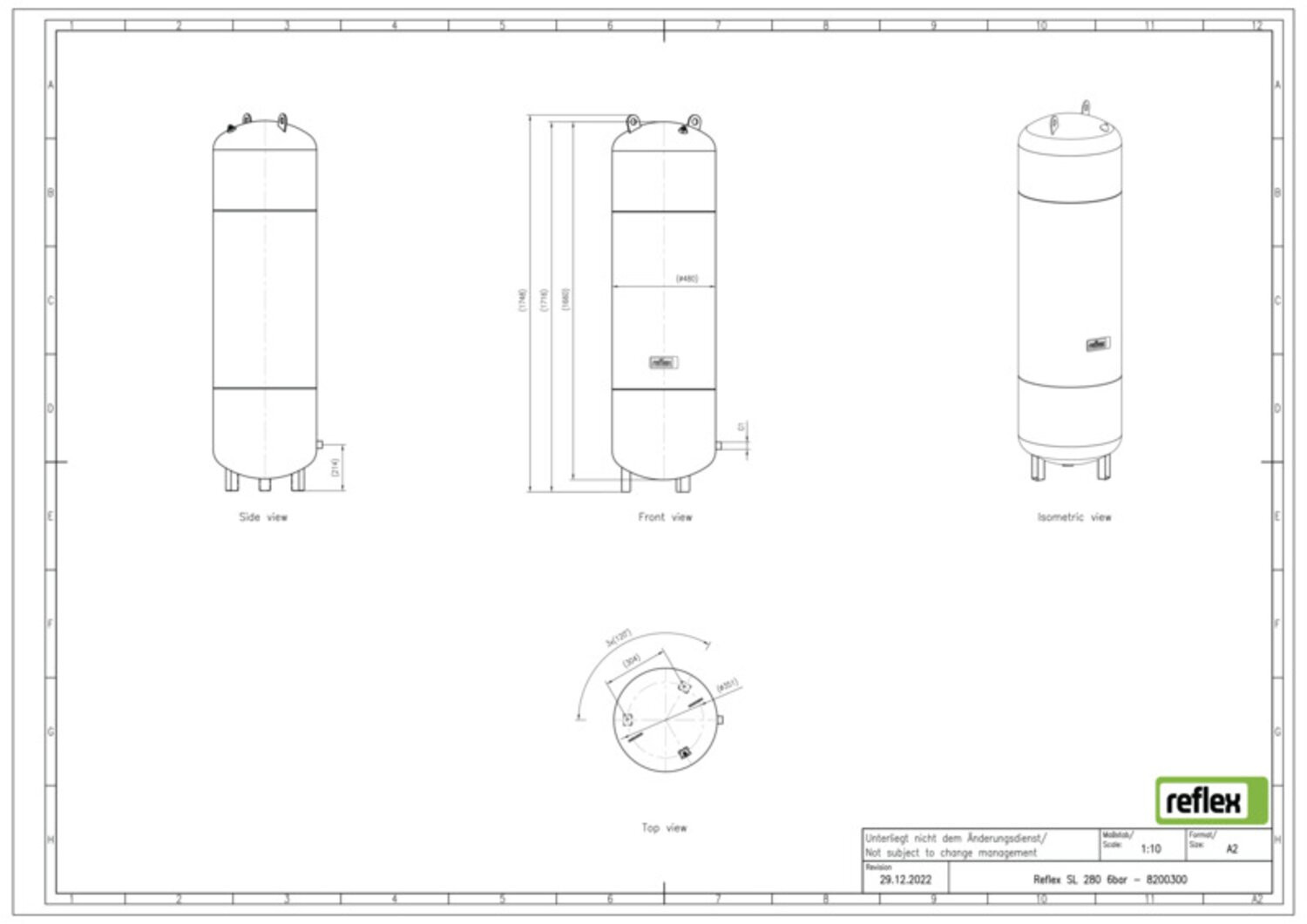 schlankes Gefäß für geschlossene Heiz- und Kühlsysteme, nicht tauschbare Halbmembran nach DIN EN 13831, mit werkseitig druckbeaufschlagten Gasraum, Epoxidharzbeschichtung, mit Gewindeanschlüssen, Frostschutzmittelzusatz mind. 25-50 %, max. Systemtemperatur 120 °C