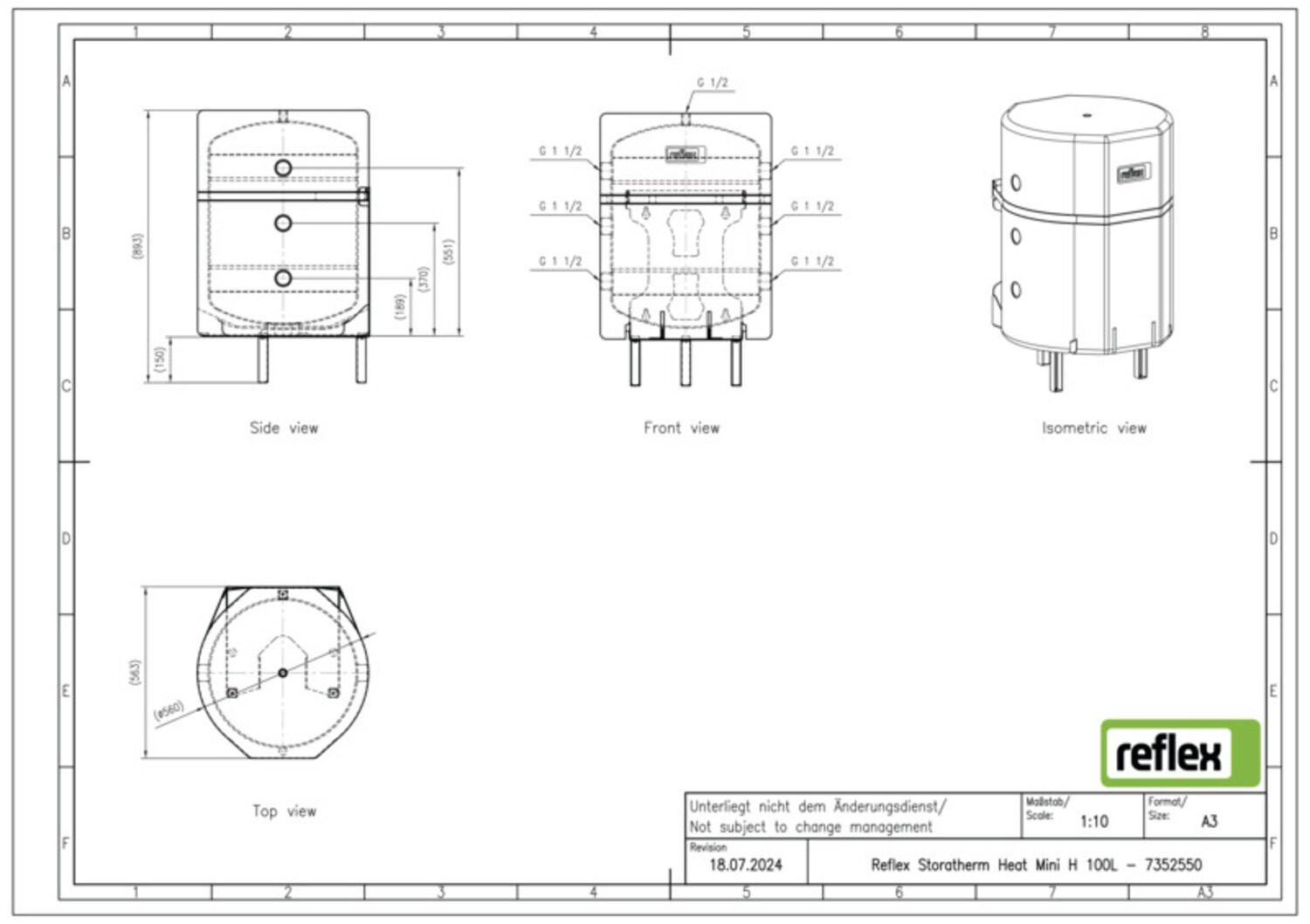 Reflex Speicher Storatherm Heat Mini H 100 Ø 480 mm, mit Isolierung 560 mm, mit horizontalen Anschlüssen