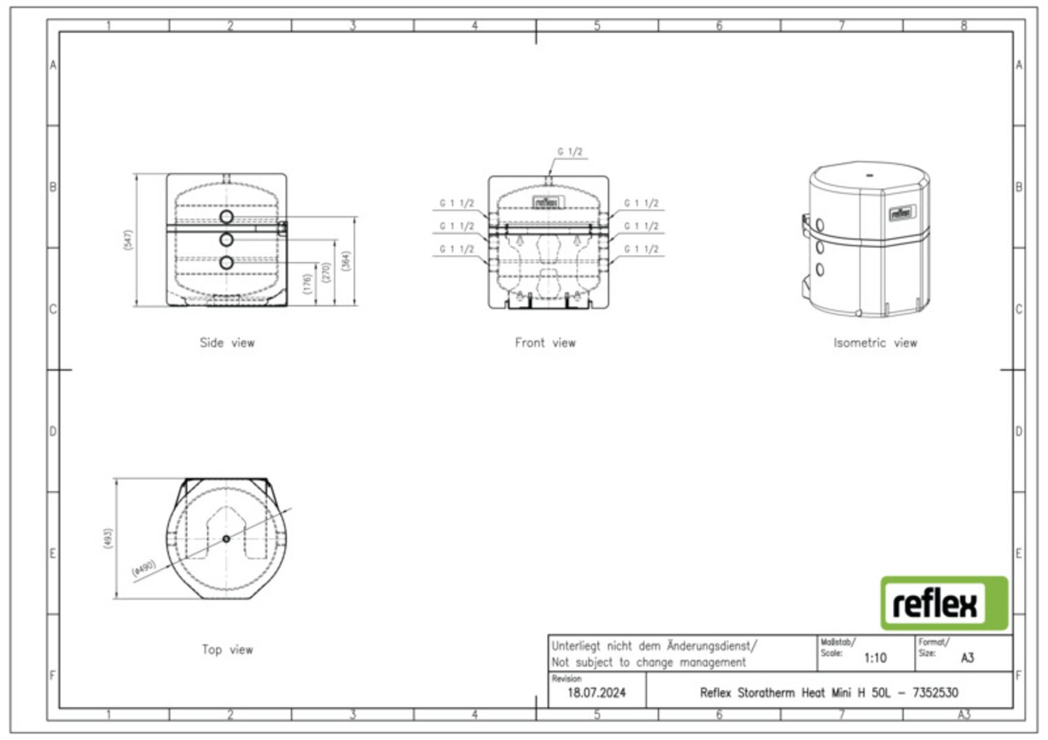 Reflex Speicher Storatherm Heat Mini H 100 Ø 480 mm, mit Isolierung 560 mm, mit horizontalen Anschlüssen W817553