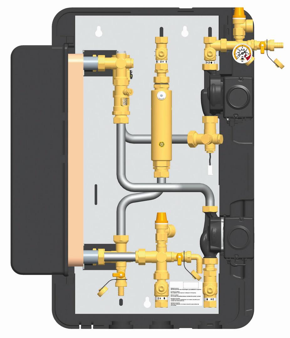 mit eingebauter Solarregelung RemaSol C/2i und Plattenwärmetauscher für Heizungswasser, mit allen notwendigen Armaturen bestückt, Plattenwärmetauscher, Primär- und Sekundärpumpen, Sicherheitsventil, Schwerkratbremsen, Manometer, Entlüfter, Spül- und Befülleinheit, Thermometer