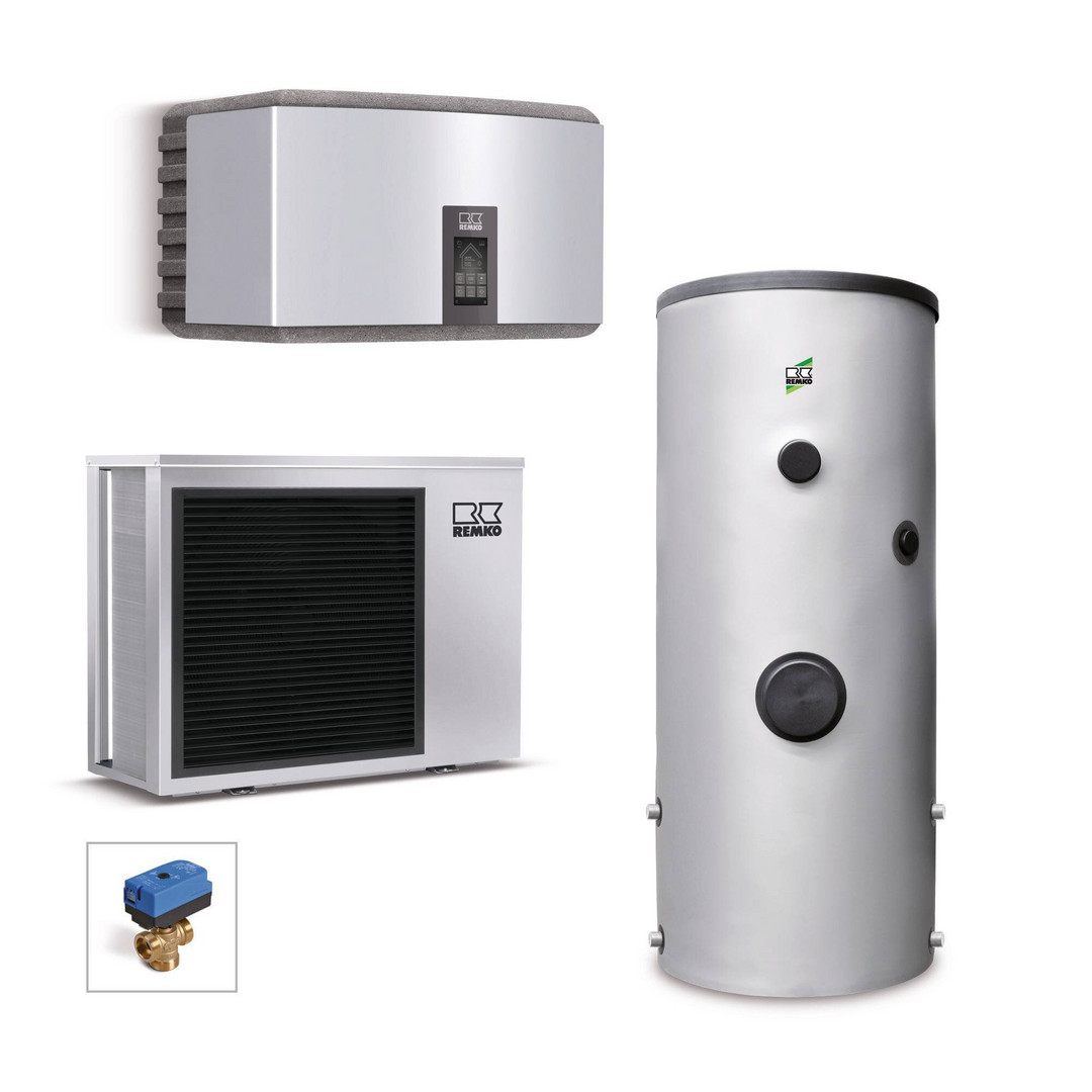 Kombination mit einem konventionellen Wärmeerzeuger (bivalent alternativ) möglich, Kombipufferspeicher KWS 300 dient zur hydraulischen Entkopplung bei großen Volumenströmen, Kühlfunktion für den Sommer, Trinkwasserbereitung mittels 300 l emailliertem Trinkwasserspeicher, bestehend aus Innenmodul mit REMKO Smart-Control Touch, 1x Außenmodul, Kombipufferspeicher KWS 300 (300 l), 3-Wege-Umschaltventil, Smart-Serv, eingebauter Heizstab 6 kW bzw. 9 kW