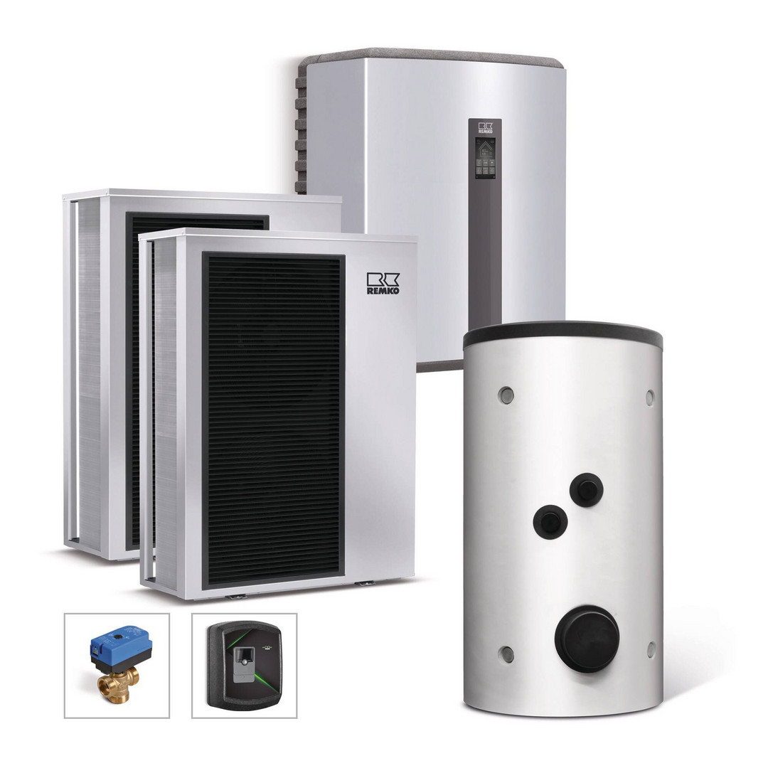 für Anwender mit hoher Heizleistung und hohem Warmwasser-Bedarf, neben Heizfunktion auch die Trinkwasserbereitung, Kühlfunktion, Trinkwasserbereitung mittels 500 l Pufferspeicher und elektronisch geregelter Frischwasserstation im hygienischen Durchflussverfahren, bivalent alternativ und monoenergetisch betriebene Systeme möglich, Pufferspeicher dient als hydraulische Weiche bei großen Druckverlusten im Heizkreis, bestehend aus Innenmodul mit REMKO Smart-Control Touch, 2x Außenmodul, Pufferspeicher für Kühl- und Heizwasser KPS 301 (300 l), Pufferspeicher für Trinkwasser HPS 500 (500 l), Smart-Serv, eingebauter Heizstab 9 kW, elektrisch geregelte Frischwasserstation EFS 21, 3-Wege-Umschaltventil