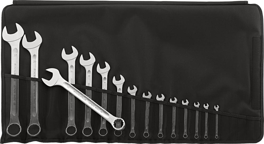 Inhalt: 15 Ring-Maulschlüssel 6; 7; 8; 9; 10; 11; 12; 13; 17; 19; 22; 24; 27; 30; 32 mm.