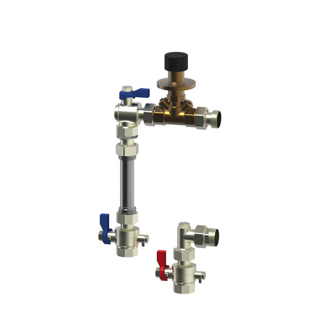 Heizkreisverteiler-Anschlusseinheit mit Oventrop Differenzdruckregler, 3x Absperrhähnen und Vorrichtung für den Einbau eines Wärmemengenzählers, stufenlose Sollwerteinstellung von 50 - 300 mbar für konstante Druckverhältnisse, Passstück 130 mm 1" und 110 mm 3/4", 2x Kugelhähne mit Aufnahme für je einen direkt eintauchenden Temperaturfühler, Schnittstelle Temperaturfühler M 10 x 1 AG, max. 6 mm, direkt eintauchend, mit 2x Flachdichtungen
