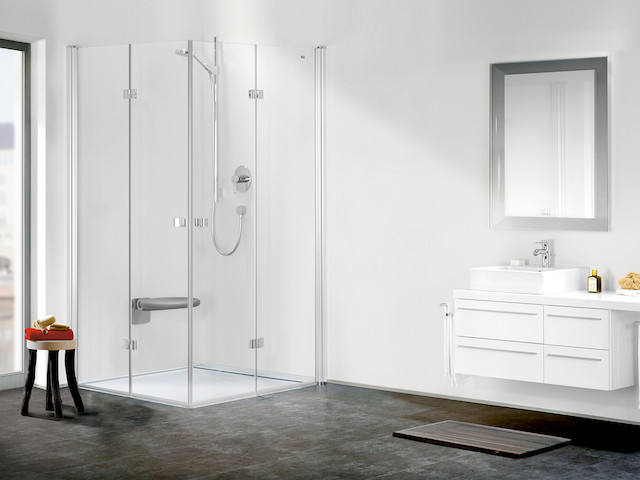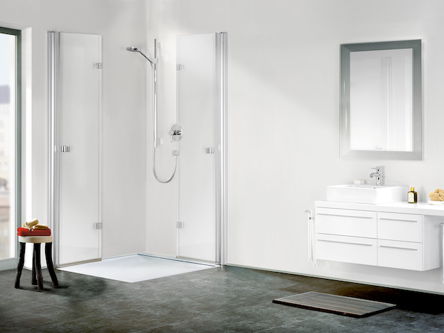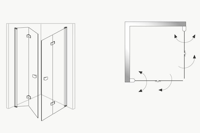 Dreh-/Falttür, 4tlg., nach innen und nach außen öffnend, mit Hebe-Senk-Mechanismus (stufenlos einstellbar), Für die Montage in Raumecken mit vorhandenem Fenster