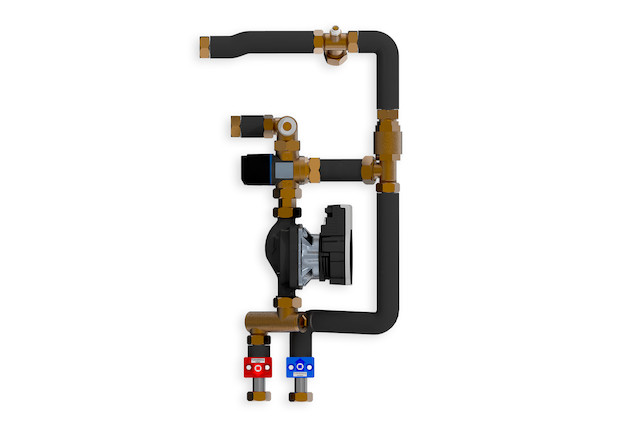 Flächenheizungsmodul bestehend aus wartungsfreier Nassläufer-Umwälzpumpe (Yonos Para 25/8-75/SC), mit blockierstromfestem Synchronmotor nach ECM Technologie und integrierter Leistungsregelung zur stufenlosen Differenzdruckregelung, thermisches Mischventil mit Regelknopf zur einfachen Einstellung der gewünschten Heizwassertemperatur mit Temperatureinstellbereich 20-47 Grad, eine Schutzhaube schirmt den Regelknopf vor unsachgemäßer Bedienung ab und kann verplombt werden, integrierter Rückflussverhinderer und Entlüftungsventil mit manueller Betätigung, nahtlos geschweißtem Rohr, 18 x 1 mm aus nichtrostendem CrNiMo-Stahl, Werkstoff-Nr.: 1.4401 nach DIN EN 10088, Rohrenden mit einem Bördelflansch zur Aufnahme einer Flachdichtung und Überwurfmutter, Rohrleitungen gedämmt mit schwarzem flexiblem Schaumstoff, Dämmschichtdicke 9 mm WLG 033, Baustoffklasse B1 (schwerentflammbar) nach DIN 4102, BL-s3-d0 nach DIN EN13501-1, Anschlussverbindungen G 3/4" IG flachdichtend mit Überwurfmutter nach DIN 3292, aus Messing blank, mit min. 2 mm starken Hochdruck-Aramidfaserdichtung gebunden mit NBR, trinkwasserberührte Anlagenteile, entsprechenden Materialspezifikationen der UBA-Bewertungsgrundlage für metallene Werkstoffe, Einstellbereich 20-47 Grad, Heizleistung ca. 8 kW (Delta T= 7 K), Förderleistung 1050 kg/h, Restförderhöhe 350 mbar, Leistungsaufnahme 10-75 W (230V), Gewicht 4,35 kg