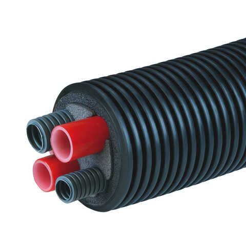 isolierte Anschlussleitung für Anbindung von Luft/Wasser-Wärmepumpen, bestehend aus zwei korrosionssicheren Mediumrohren aus PE-Xa SDR 11 PN6, vernetzt nach DIN 16892/16893 mit roter Sauerstoffdiffusionssperre EVOH nach DIN 4726 und zwei Leerrohren für die Kabelführung, Rohre mit effizienter und elastischer Schaumisolation aus vernetztem XPE mit geschlossener Mikrozellenstruktur versehen, minimale Wasseraufnahme von <1% nach DIN 53428, gewellte PE-HD-Außenmantel für optimalen Schutz des Leitungssystems, Gesamt-Außenmanteldurchmesser 145 mm, Abmessungen PE-Xa Rohr 40 x 3,7 mm (DN 32), Außendurchmesser Leerrohre 32 und 25 mm