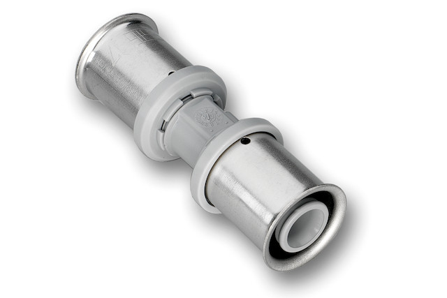 KU-Pressfitting hergestellt aus dem Hochleistungskunststoff PPSU und MS-Pressfitting aus Messing, mit Stützkörper und jeweils drei fixierten Edelstahl-Hülsen für die unlösbaren Verbindungen mit den Systemrohren Alu-Laserplus