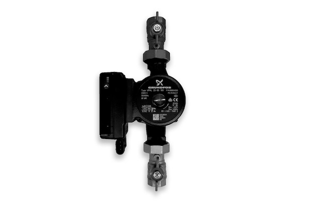 mit Umwälzpumpe 32-105 180, mehrstufig mit konstanter Drehzahl bis 6.000 l/h Volumenstrom, die Pumpe dient als Zubringerpumpe (ZUP) im Zusammenhang mit einem Trennspeicher, für die Wärmepumpe (Ladeseite) mit Absperrungen, Schwerkraftbremse und Isolierschalen, Einsatz Luft/Wasser Wärmepumpe bis 31 kW