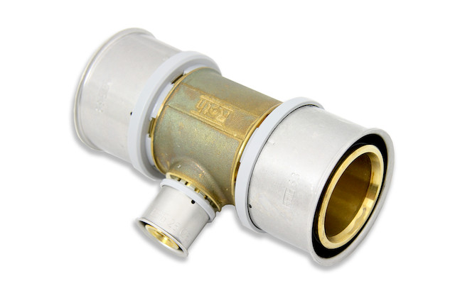 KU-Pressfitting hergestellt aus dem Hochleistungskunststoff PPSU und MS-Pressfitting aus Messing, mit Stützkörper und jeweils drei fixierten Edelstahl-Hülsen für die unlösbaren Verbindungen mit den Systemrohren Alu-Laserplus